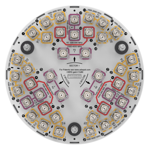 42-port Tri-sector antenna, 6x 698-896MHz, 24x 1695–2690MHz and 12x 3300- 4000MHz, 65° Horizontal Beamwidth, fixed tilt.
