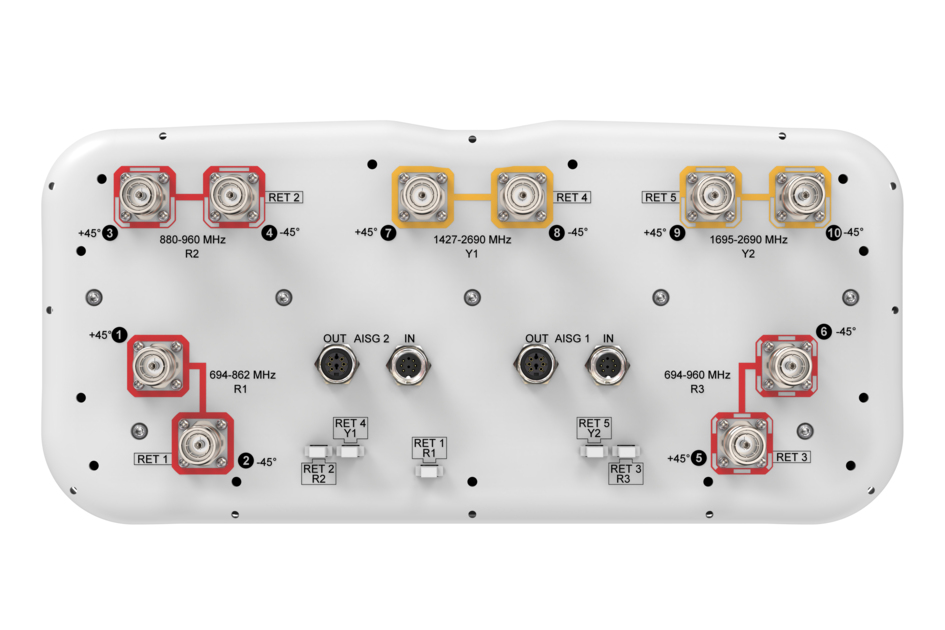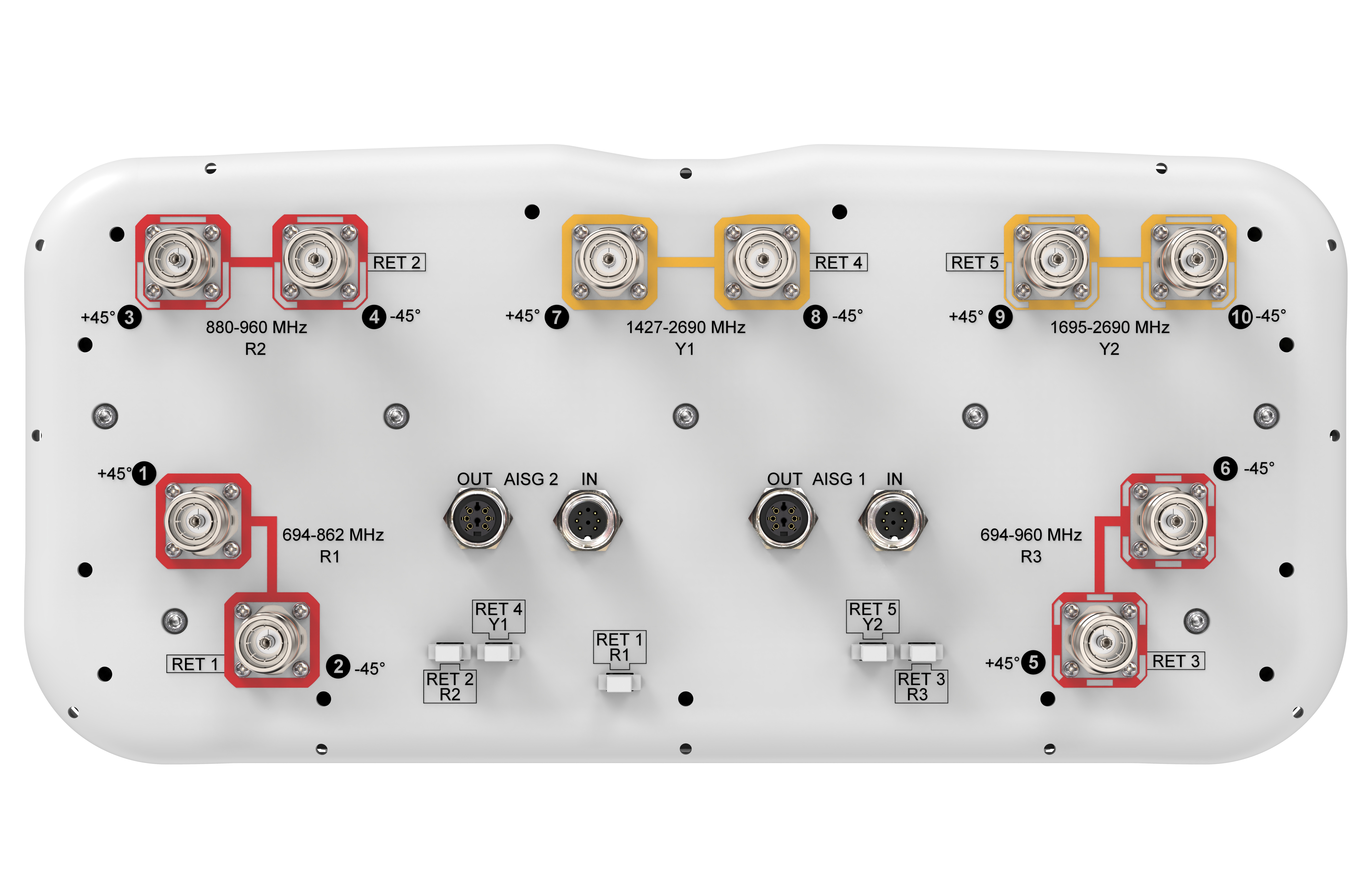10-port sector antenna, 2x 694-862, 2x 880-960, 2x 694-960, 2x 1427-2690 and 2x 1695-2690 MHz 65° HPBW, 5 x RET
