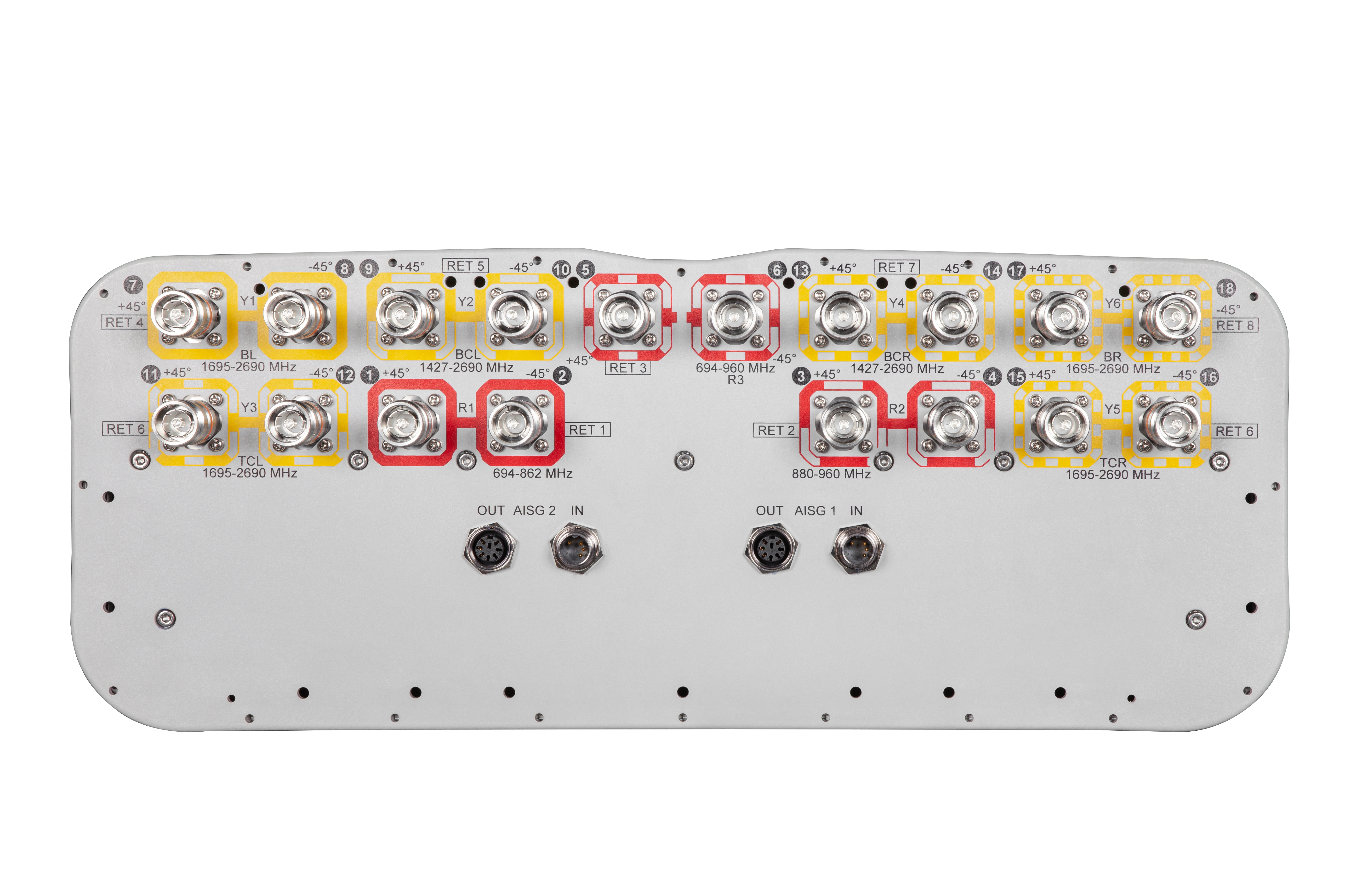 18-port sector antenna, 2x 694-862 (R1), 2x 880-960 (R2), 2x 694-960 (R3), 4x 1427-2690 (Y2&Y4) & 8x 1695-2690 (Y1/Y3/Y5/Y6) MHz, 65° HPBW, 8x RET.
