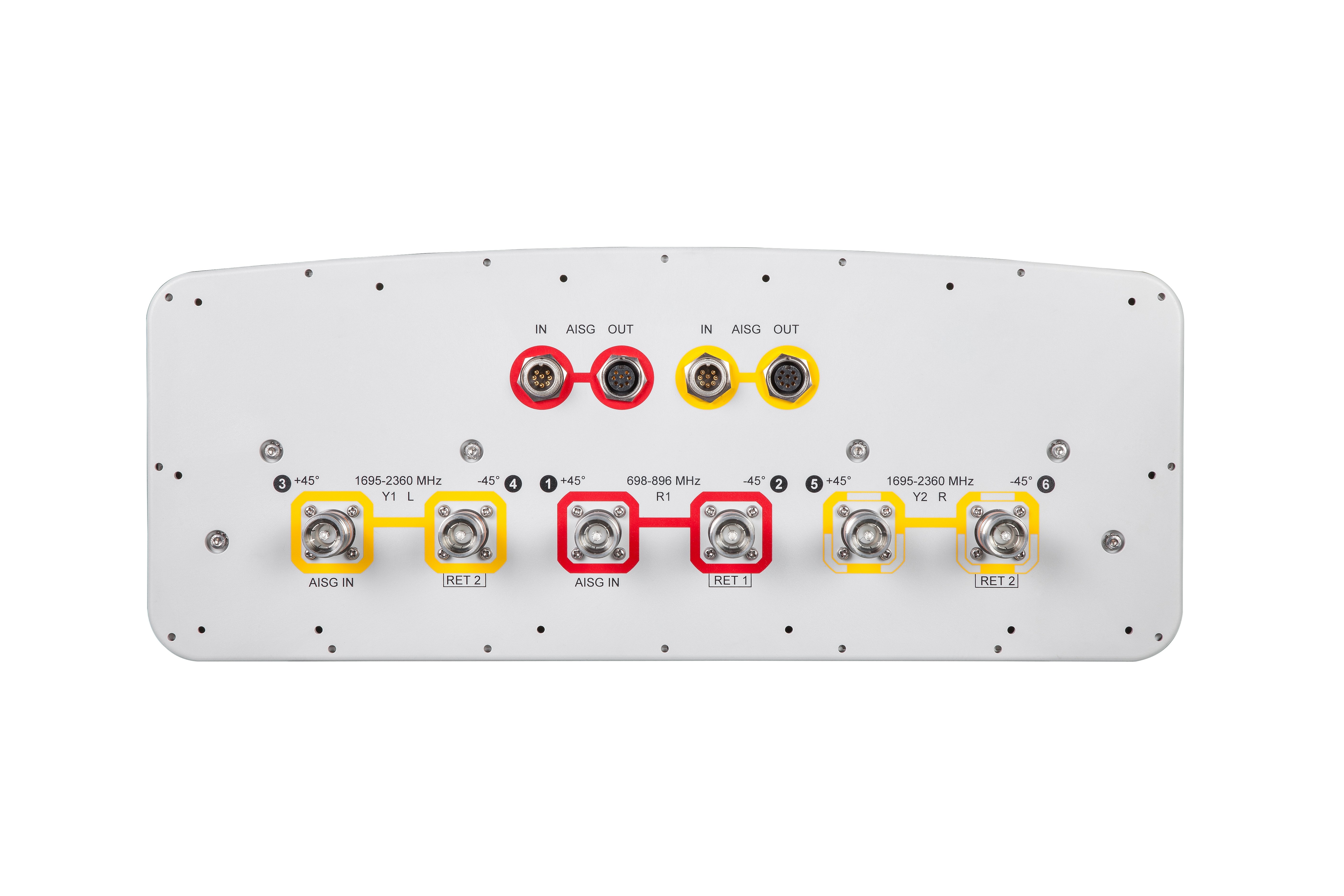 6-port Next Generation PerforMax™ sector antenna, 2x 698–896 and 4x 1695–2360 MHz, 45° HPBW, 2x RETs and 2x SBTs