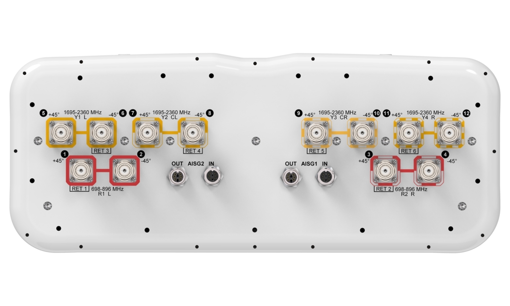 - Features broadband Low Band (698-896 MHz) and High Band (1695-2360 MHz) arrays for 4T4R (4X MIMO) capability for Band 14, AWS, PCS and WCS applications