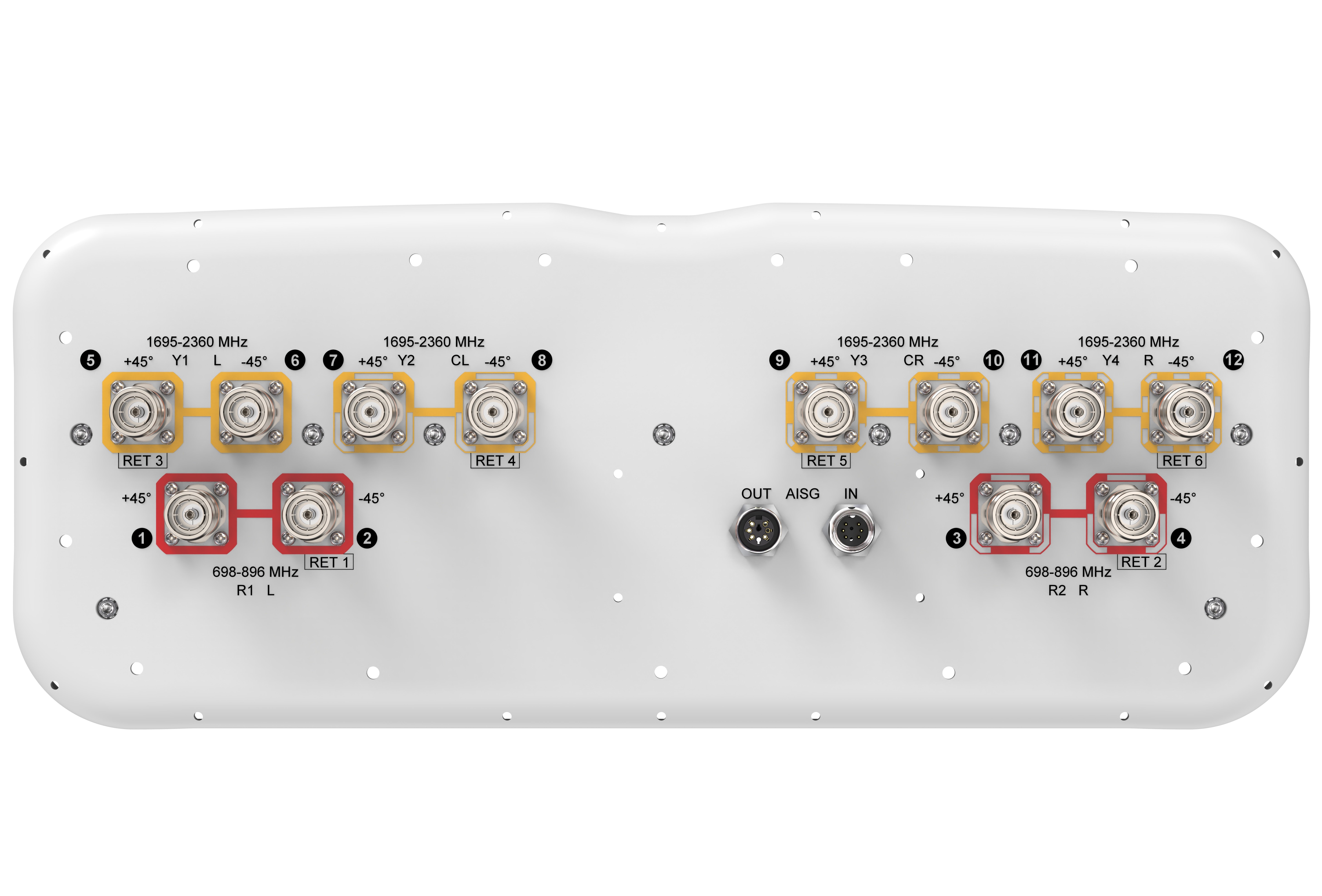 12-port sector antenna, 4x 698–896 and 8x 1695–2360 MHz, 65° HPBW, 6x RET
