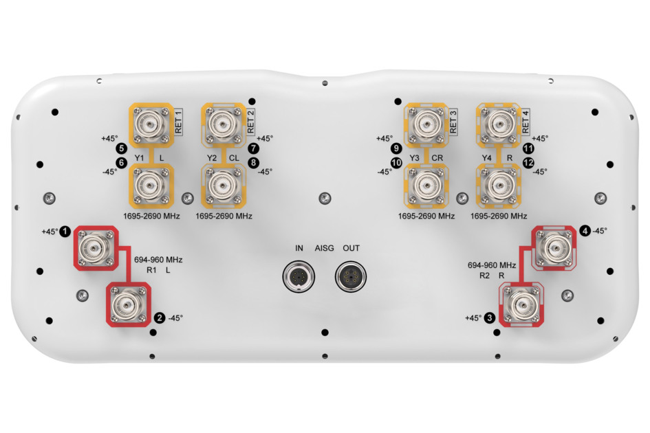 12-port sector antenna, 4x 694–960MHz 8deg fixed tilt and 8x 1695-2690 MHz, 65° HPBW, 4x RET