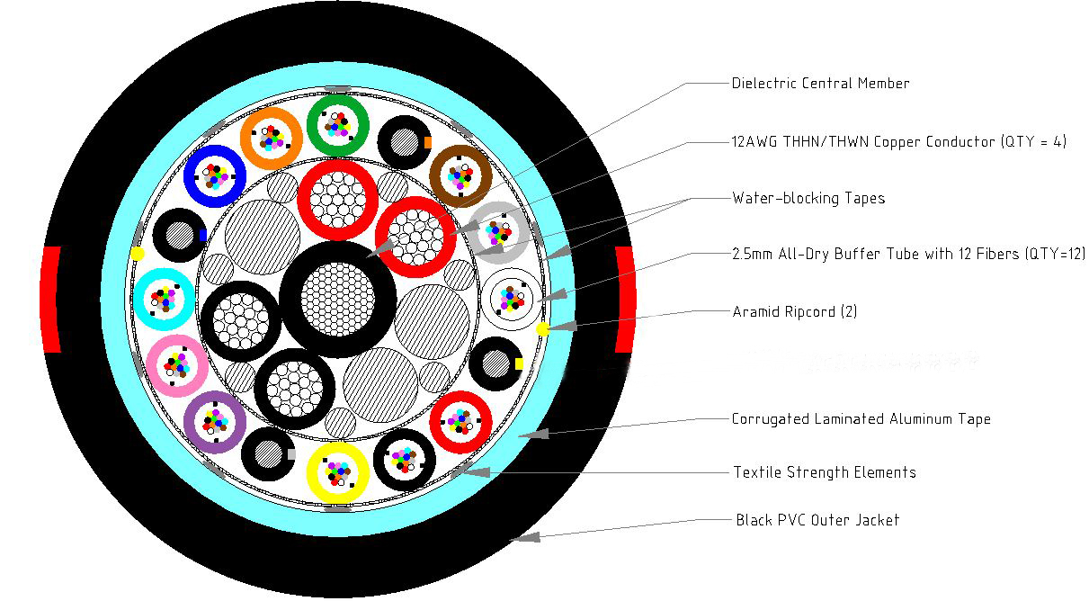 PowerShift Metro® Hybrid Cable with aluminum armor, 4X12AWG Power Conductors, 144-fiber
