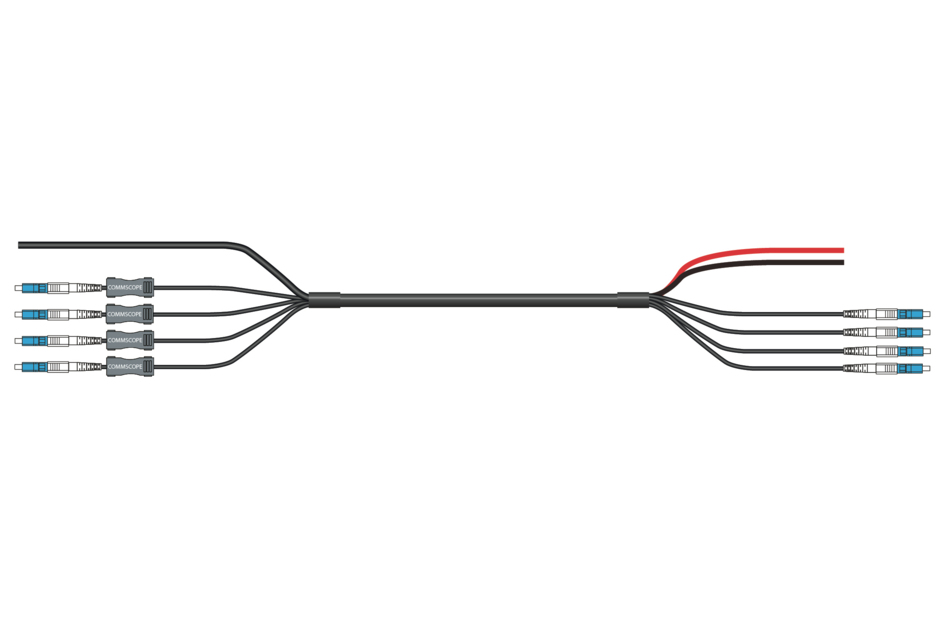 HELIAX® Hybrid Cable Assembly, 6-OVP box to RRU, Power Cord to RRU UR Type TC-ER, 2 Power conductors 6 AWG RRU, 6 AWG OVP, 4 fiber Bi-Di Jonhon adapter compatible pvc jacket aluminum armor, OVP gland insert kit included