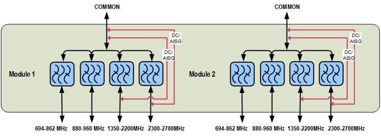 Twin Quadplexer 700-800//900//1400-2100//2300-2600 MHz, DC bypass on 1400-2100 MHz port and 2300-2600 MHz port, with 4.3-10 connectors