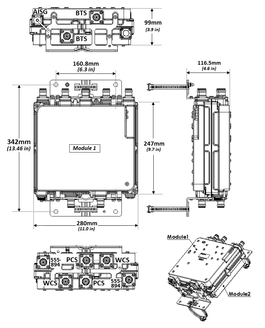 Twin TMA PCS/WCS with 555-894 MHz bypass,4.3-10 connectors