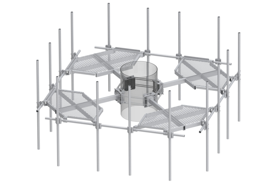 Atlas 4-Sector Monopole Platform Base kit, 15 in to 45 in OD, 2-7/8 in OD x 10 ft 6 in face & (16) 2-7/8 in OD x 126 in antenna pipes. Top rail ordered separately.